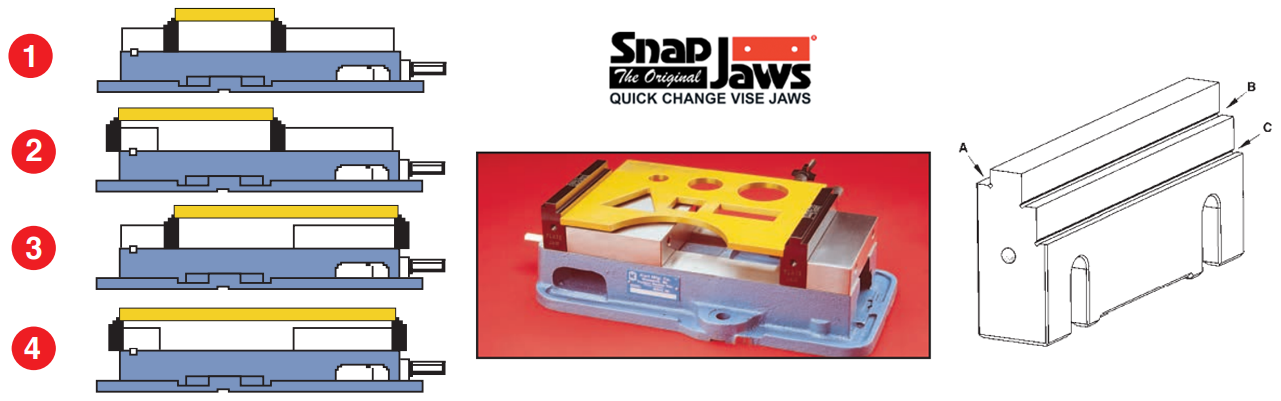 Plate Jaws are designed to hold fixtures or oversized plates. Plate jaws are reversible with 3 different step sizes. Plate Jaws can mount on outside positions of Kurt vises. This design allows a combination of sixteen different holding positions.